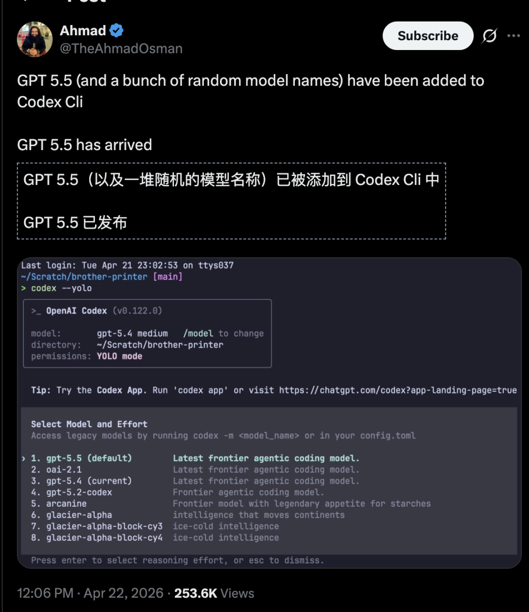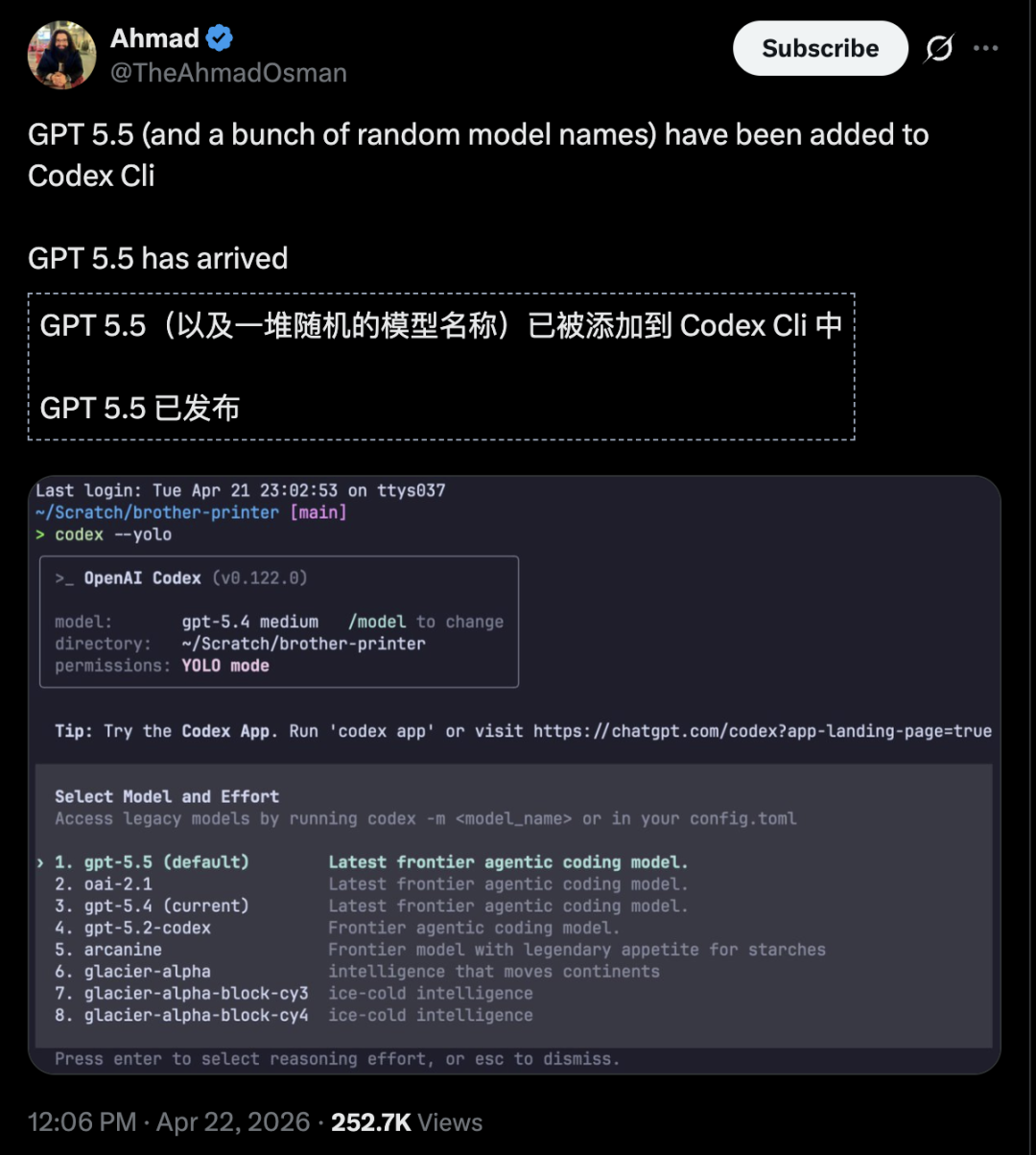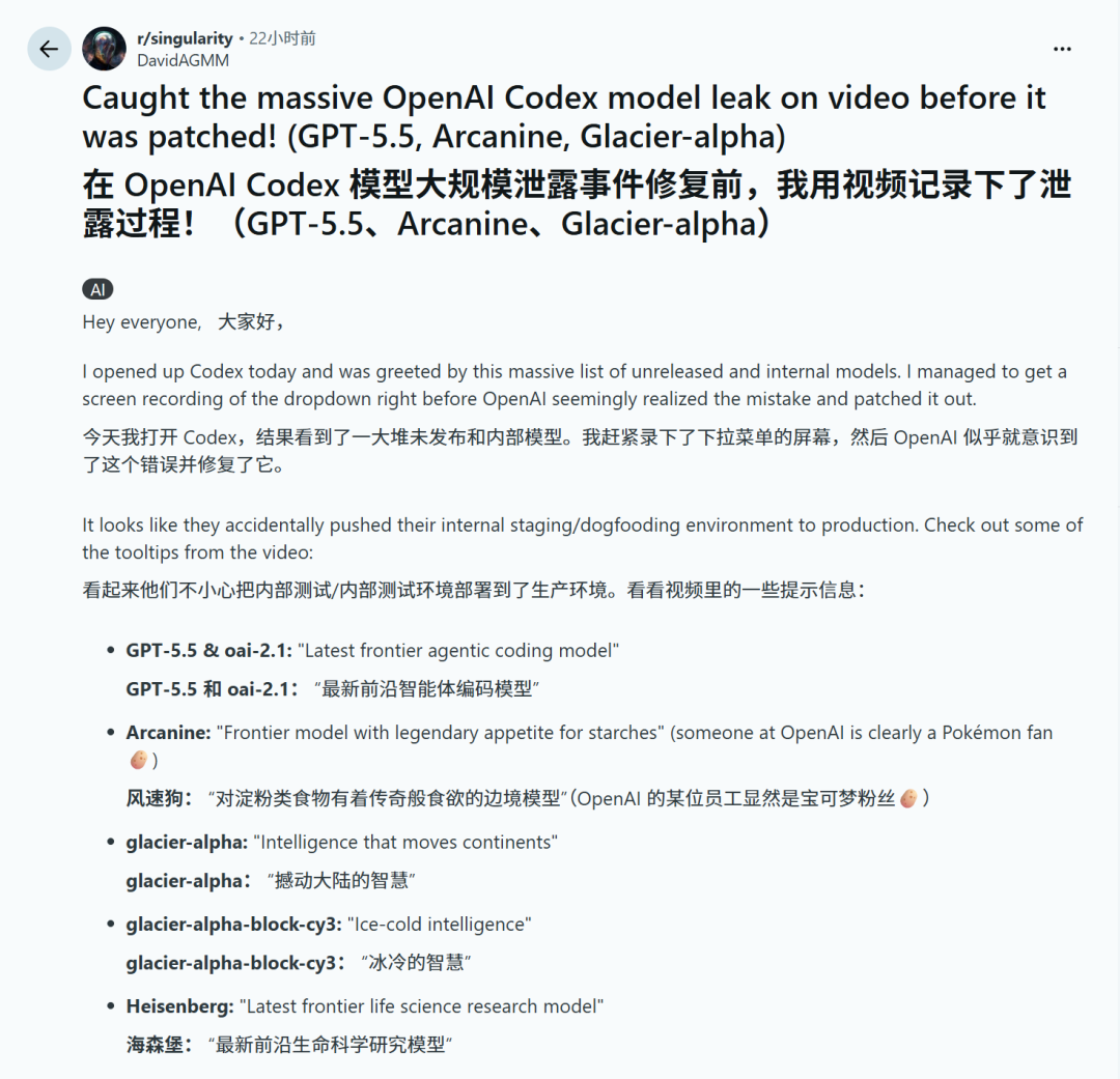 【新智元导读】就在刚刚,Codex平台爆发重大泄漏事故,内部测试环境疑似误推生产环境。GPT-5.5、「风速狗」Arcanine、「海森堡」以及神秘的Glacier集体亮相。奥特曼口中那个「比Transformer更伟大的架构」,难道已经藏在这些模型背后?