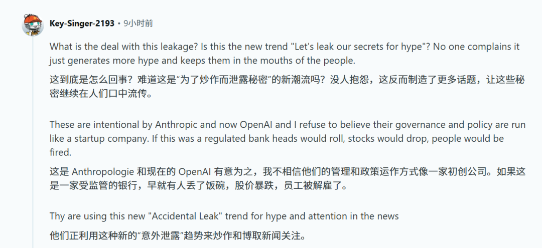 有人直接开炮:「如果这是一家受监管的银行,人头要落地,股价要跌,员工要被开除。OpenAI和Anthropic正在用'意外泄露'这种新套路制造话题。」